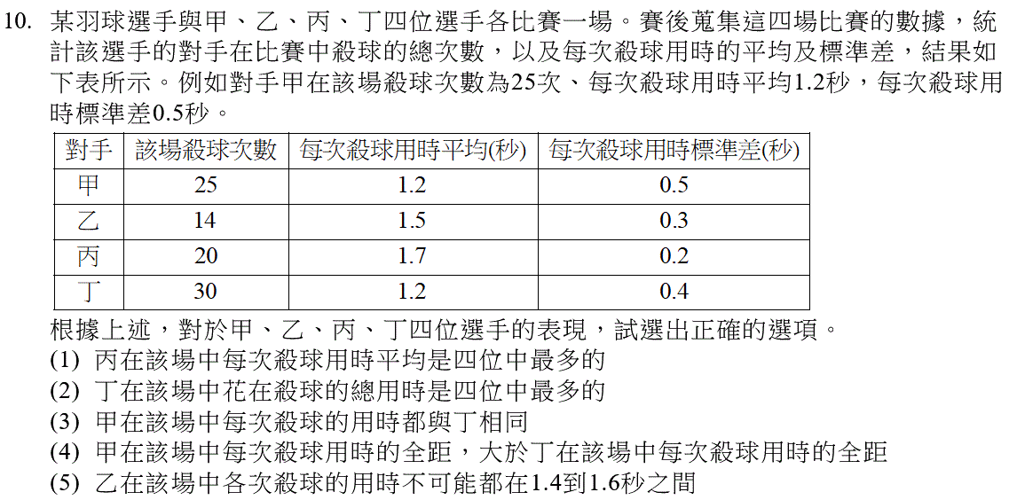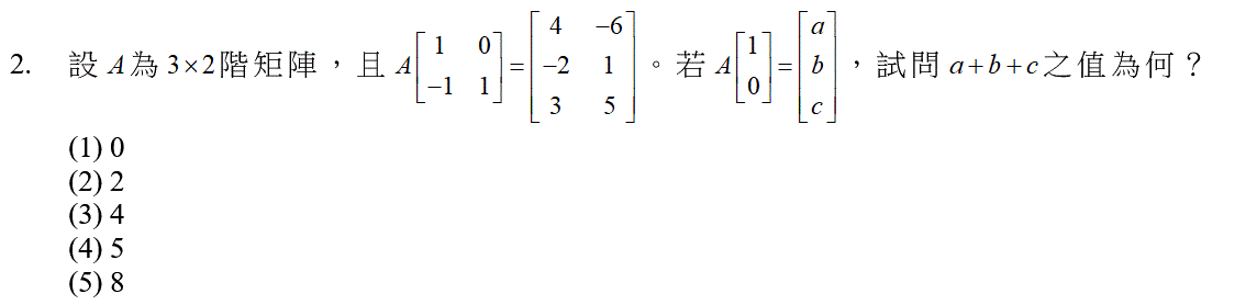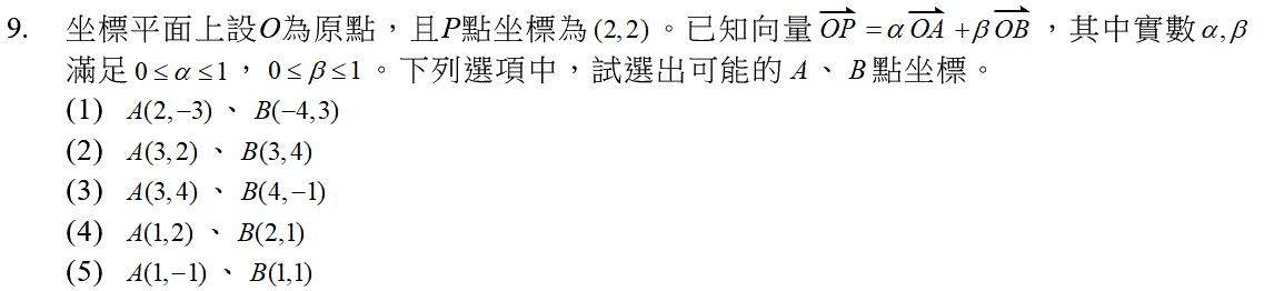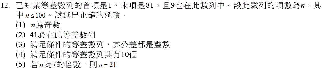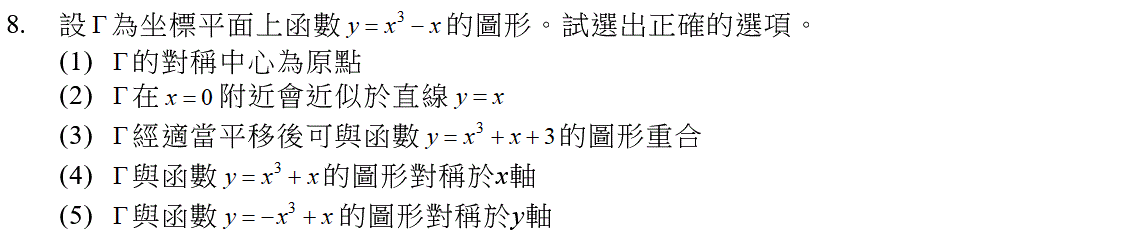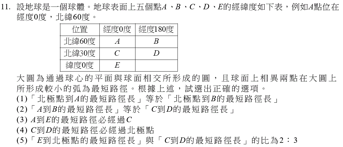 第8題至第12題,每題有5個選項,其中至少有一個是正確的選項。各題之選項獨立判定,所有選項均答對者,得5分;答錯k個選項者,得該題(n-2k)/n的分數;但得分低於零分或所有選項均未作答者,該題以零分計算。